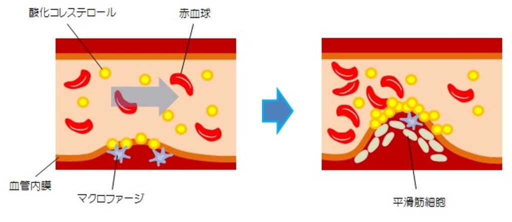 動脈硬化 (アテローム性動脈硬化) は、生活習慣病が原因となり起こる病態の一つであり、さまざまな疾患と非常に強い相関があります。動脈硬化が起こる過程として、まず、酸化コレステロール (LDL) を含むコレステロールが血液中から血管内膜の内側へ入り込むと、血管内膜中のマクロファージやT細胞などの免疫細胞がLDLを異物と認識して取り込み、サイトカインなどが放出されます。平滑筋細胞が免疫細胞から産生されたサイトカインなどの刺激を受けると、血管内膜へ浸潤・遊走します。これにより動脈壁が厚くなることで血栓ができ、血液の流れが悪化します。