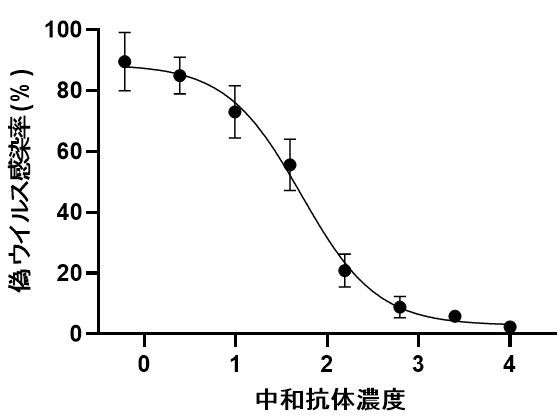 本試験では、SARS-CoV2のSタンパク質を持つ偽ウイルス及びACE2発現細胞を用いて、被験物質の抗コロナウイルス効果を検証します。オミクロン株などの変異株に対する評価も可能です。