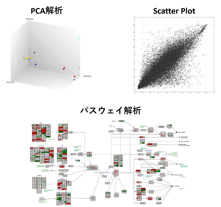 ご希望の細胞種・条件下で培養した細胞からRNAを回収し、DNAマイクロアレイ解析や次世代シーケンサー解析により、特定条件下で特異的に発現量が変化する遺伝子を網羅的に同定します。被験物質の新規薬理効果の探索などに有用です。また、発現量の比較以外にも、サンプル効果の分類、表現型やパスウェイとの関連など、複雑な解析をお客様に代わって弊社で行わせていただきます。