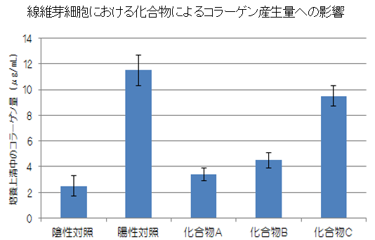 本試験では、肌に張り・潤いをもたらす機能性物質の検証・新規検索を目的として、Ⅰ型コラーゲンやヒアルロン酸の産生量を測定することで、被験物質の線維芽細胞賦活作用を検証します。