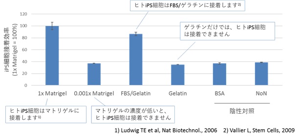 通常フィーダー細胞上で、ヒトiPS細胞は維持されます。しかし、再生医療への応用はもちろん、各種細胞実験での取り扱いやすさという点においても、フィーダー細胞を用いない培養系が望まれます。ヒトiPS細胞をフィーダー細胞を用いずに維持する場合、基本的にはマトリゲルやラミニンなどの基質をあらかじめプレートやディッシュにコートしておく必要があります。ところが、これらの試薬は高価なものが多いのです。また、ロット間の差があったり操作が煩雑であったりします。そのため、ヒトiPS細胞の培養には、より安価で、かつ、安定で簡便な手法が求められています。