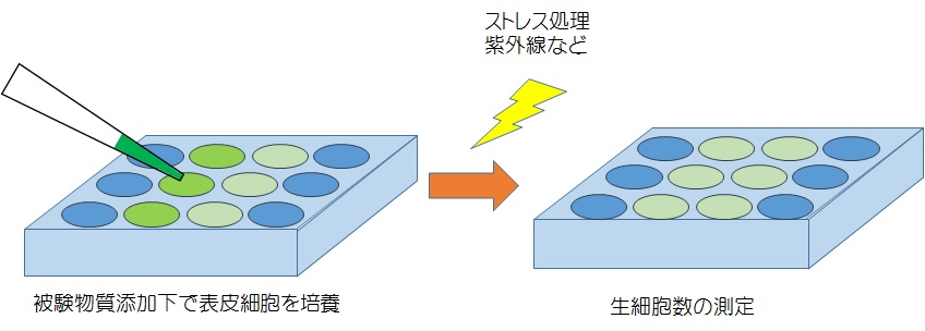 本試験では、UVや酸化などのストレスから肌を保護する機能性物質の検証・新規検索を目的として、表皮角化細胞を用いた被験物質の細胞賦活作用、ストレス保護・回避作用を検証します。