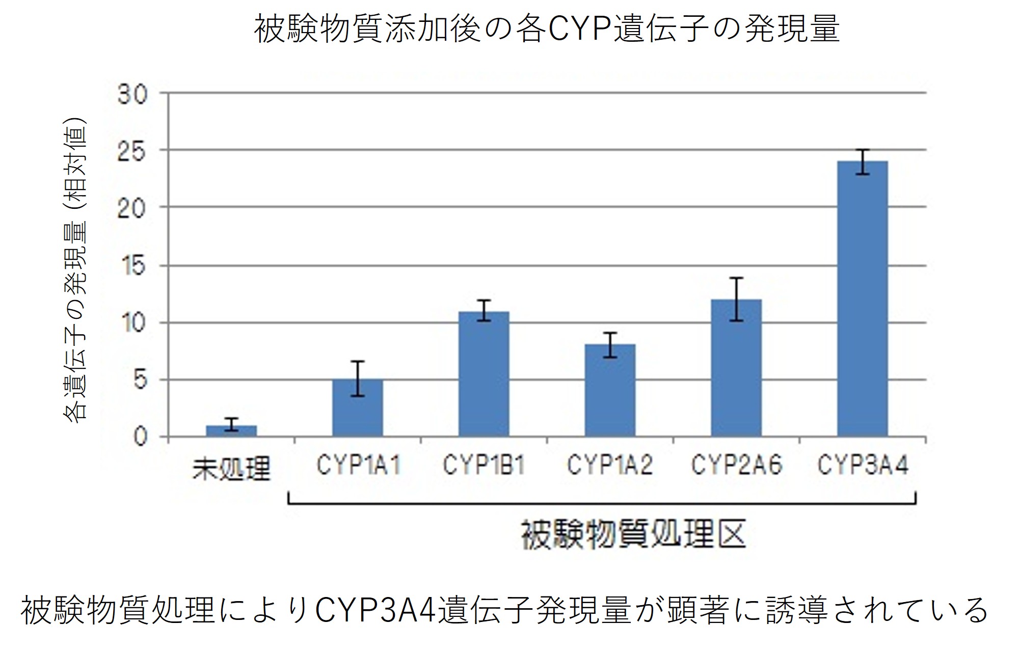 多くの薬物は肝臓に存在する水酸化酵素・シトクロムP450 (CYP) により水溶性物質へと代謝され、尿として体外に排出されます (解毒作用)。本試験では、肝機能改善における新規物質の評価・検索を目的として、肝細胞を用いた被験物質のCYP遺伝子発現増加作用、CYP活性化作用などを検証します。