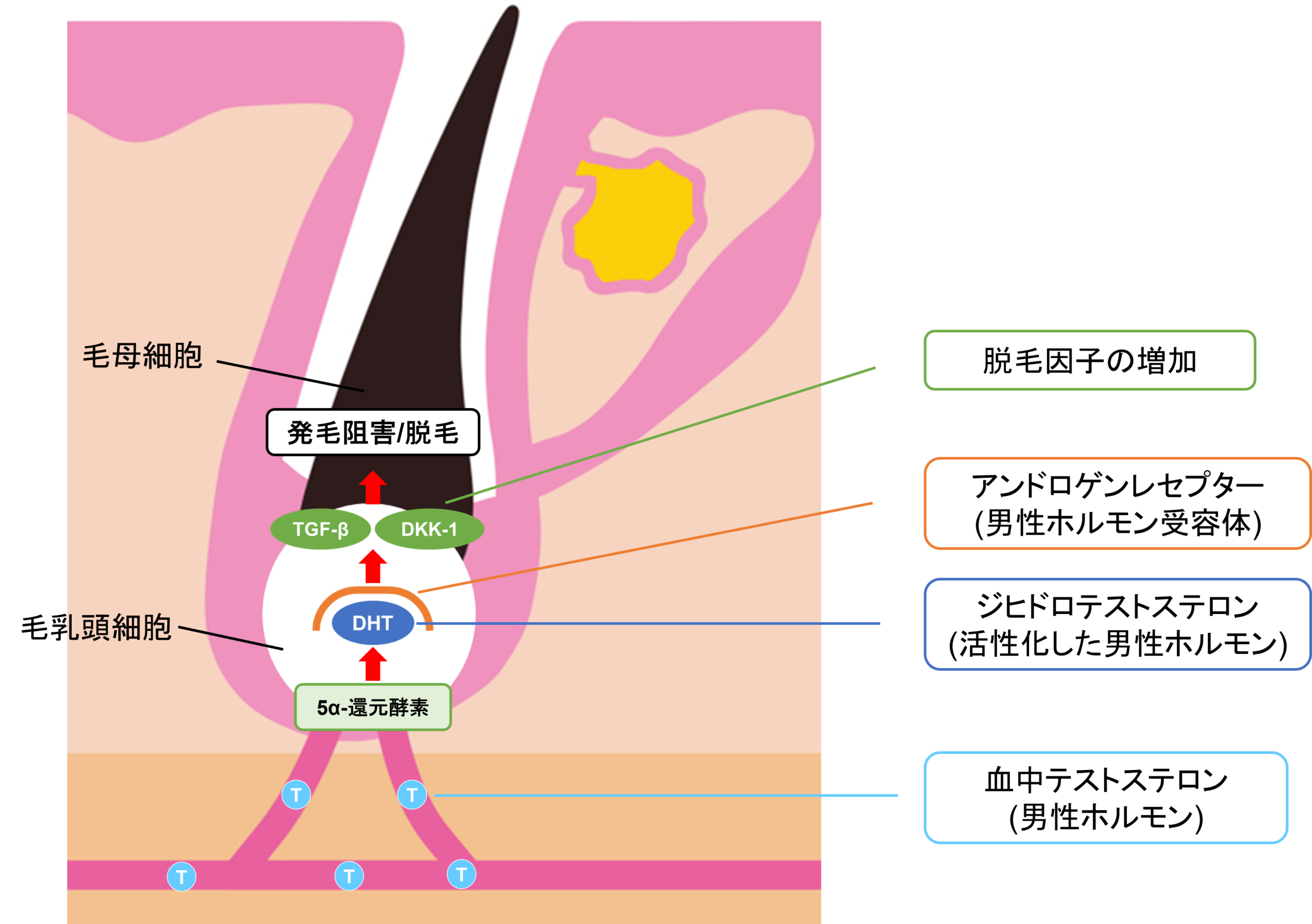 男性型脱毛症(AGA)では、男性ホルモンの一種であるテストステロンがDHT(ジヒドロテストステロン)に変換され、DHTが毛乳頭細胞の男性ホルモン受容体に結合すると、DKK-1やTGF-βなどの脱毛因子の産生が誘導されます。これらは髪の成長を止める指令を毛母細胞に出し、成長期を短縮させることで髪が細く抜けやすくなるというメカニズムで薄毛が進行します