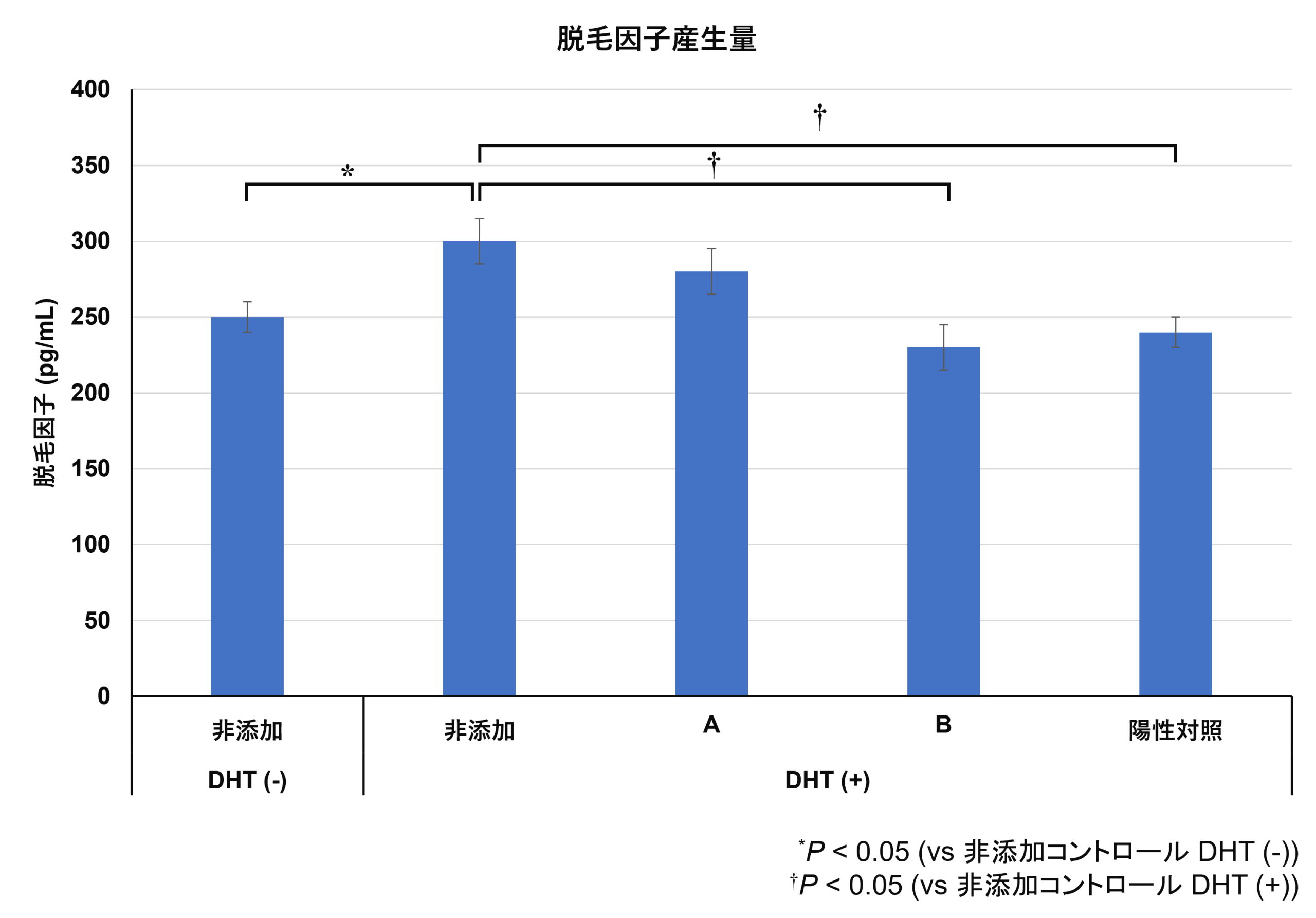 本試験ではヒト毛乳頭細胞を用いて、男性ホルモンの刺激による脱毛因子の産生量増加を、被験物質が抑制する作用を持つかどうか検証します。